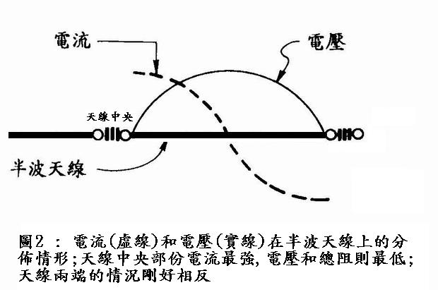 是電流或電壓在半波天線上,瞬間分佈的情形;天線的中間,電流最大,電壓為零。天線左右的兩端,情形剛好相反,電壓最高、電流為零。這說明兩點:第一,天線發射的主力部份在中間,因該處的電流最大。第二,根據歐姆定律,中間部份的總阻(IMPEDANCE)也最低,約在70歐姆左右。在天線的兩末端,總阻在數百歐姆左右,而該處電壓則最高,電流最低。明瞭此兩點,便可了解各式各樣輸送電力至天線的接法及其基本理由。