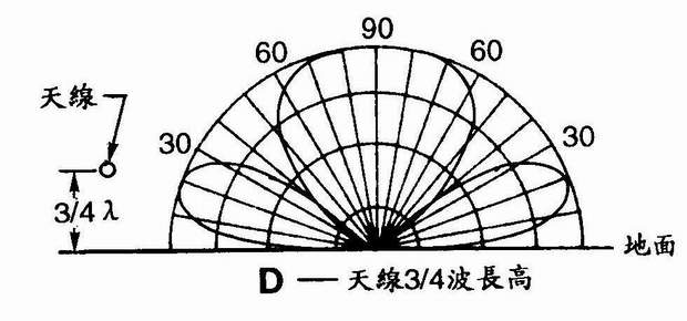 圖3D是天線在3/4波長高(20米波長即為15公尺高)的情形,電波分為三瓣,左右二邊的波瓣降低至20°,這有助於DX通訊,可惜有大部份電波直上雲霄,變成浪費。