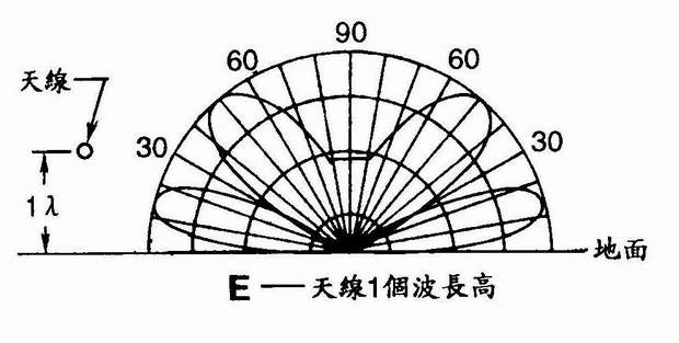 圖3內A,B,C,D,E,F及G表示天線在不同高度(以波長為單位)時的發射角度。圖3A是天線高度在1/4波長時(20公尺波段即離地為5公尺高),大部份電波在原地向上衝,部份向兩旁散出,經電離層反射回地面,如是者往復在原地踏步,不射向遠處。