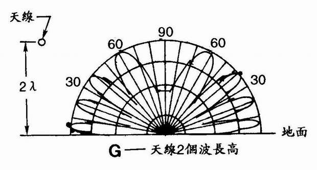 圖3F及圖3G是天線1又1/2,及2個波長高的情況。天線越高,最下層的波瓣角度越低,波瓣數量也增多。在業餘無線電界來說,天線應儘量架高,至於因高角度波瓣所造成的電能損失,反為沒有人去理會。在實際架設時所選用的高度,尚要顧及堅固、安全、狂風暴雨等因素。