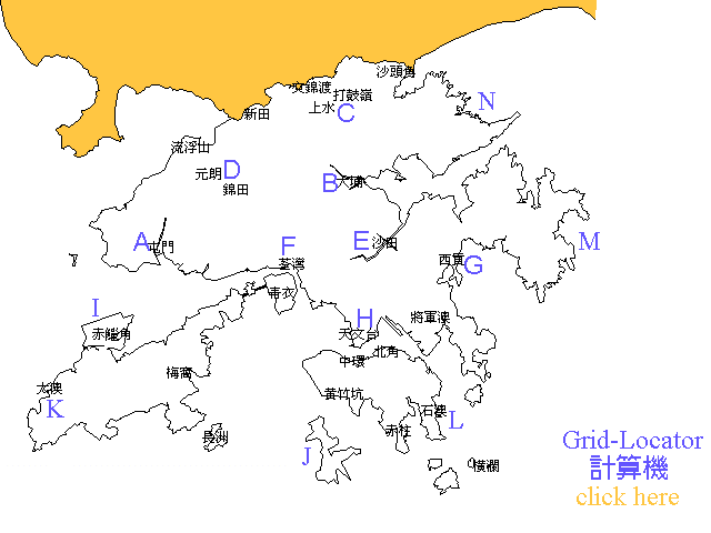在得知 Grid-Locator 的換算原理後, 如果不欲以人手每次作如此瑣碎之換算, 則要多謝我們的一班在日本府中市的朋友JA1ZGO了。他們為我等一眾發燒友編寫了一個簡單的 cgi script 用來計算 Grid-Locator , 只要輸入所在位置的精確經緯度資料, 不消一秒鐘就能算出答案來了. 以下為本港各主要地區之經緯圖, 大家不妨試算一下。
