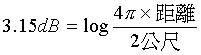 這裡 d=發射與接收兩者間之自由空間直線距離 入=傳遞中的無線電波波長, 要注意的是 d 與 入 要是同一單位(e.g.公尺) 例 A : 有兩點間(大約是由大埔市中心至大老山山頂)的直線距離是十公里(即10000公尺),現假設這兩點之間為一自由空間,這段距離對兩米波(即波長2公尺)通訊造成多少個 dB 的損失呢 ? 代入公式 :
