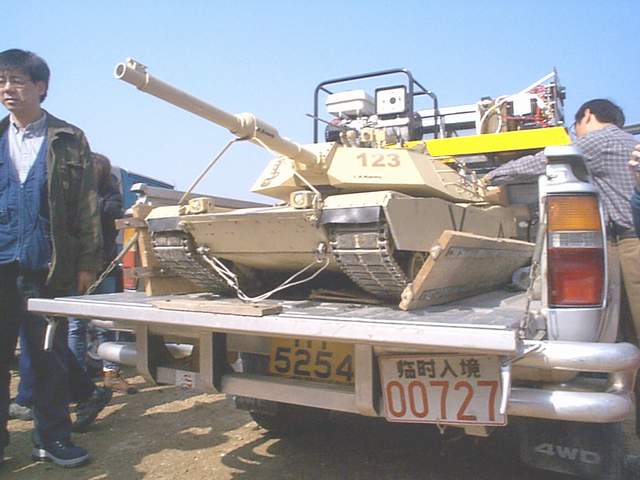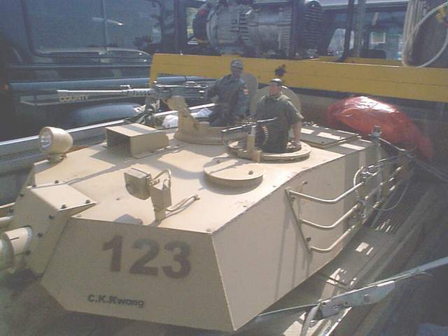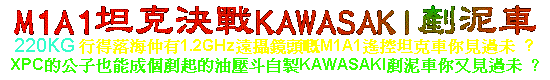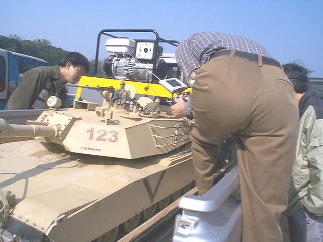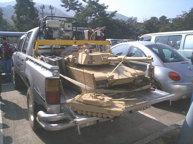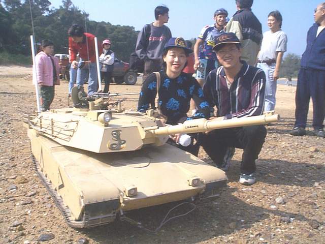 今日千禧年最後o既一日, 估唔到有幸結識到一位超級模型發燒友...鄺先生他以五年o既時間由設計, 買料, 開料, 造模, 燒焊, 整線路板......一手一腳, 竟然砌出一架 1:5 o既 M1A1 坦克車來, 當初熊貓同我講話有架咁o既車我都唔多相信, 而家就冇法子唔對鄺先生寫一個服字 ! 全架車主要都由鋁質金屬及鋼材造成, 淨重達到四百八十多磅, 初初由兩部燃油引擎推動, 聲音像真度非常高, 後來因為暫時解決不到散熱問題而改由兩組超勁電動馬達推動. 兩邊車輪都由多支油壓避震支撐, 開行及停車都在在表現出鄺先生的耐性及意志力與功夫到家. 架剷泥車就更加唔洗多講, 都係費事口水多過茶勒, 大家睇相啦 !