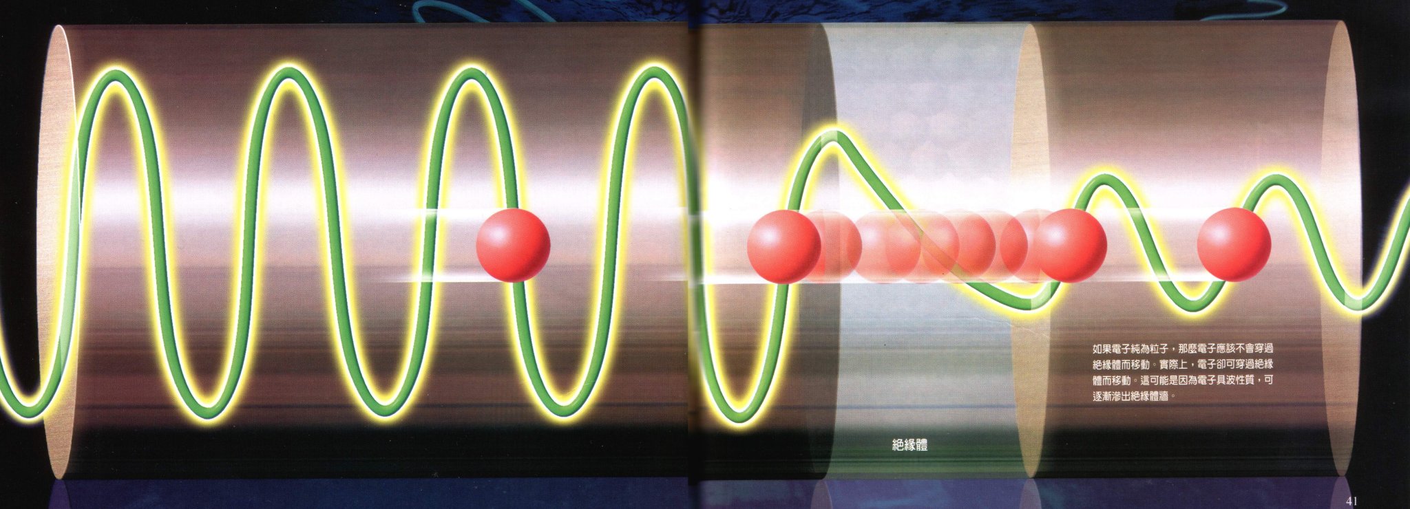 若在電極與電極中插入絕緣體,讓電流流過,情況會如何呢?如果電子純為粒子,那麼電子應該無法穿過絕緣體牆。實際上,電流卻不斷流動,如果把電子想像成「波」,電子從絕緣體牆滲出,電子就能穿過絕緣體牆。這個現象稱作「穿隧效應」(tunnel effect)。
