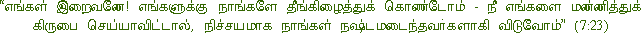 12. Our Lord! We have sinned against ourselves, and unless You grant us forgiveness and bestow Your mercy upon us, we shall most certainly be lost! (7:23)