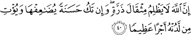 ![Indeed, Allah does not do injustice, [even] as much as an atom's weight; while if there is a good deed, He multiplies it and gives from Himself a great reward. Holy Quran 4:40](jpg/s4a40.jpg)