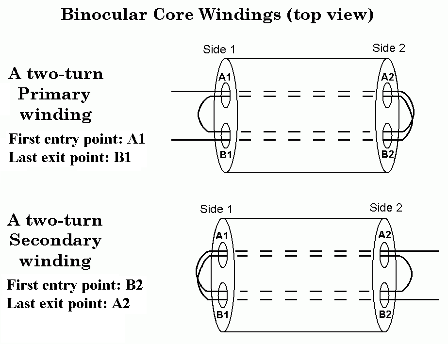 Figure 2 (click here to view) illustrates the fabrication of the impedance transformer which will be used in the Feedpoint Box. The drawing shows a binocular type core such as Fair-Rite 2873000202 or Amidon BN-73-202. For simplicity, a 2-turn primary and 2-turn secondary is shown, but for this application we'll be using a 9-turn primary (450 ohm) and 3-turn secondary (50 ohm) for a 3:1 turns, or 9:1 impedance, ratio. That's because a Beverage or Ewe presents an impedance of approximately 300 to 600 ohms.