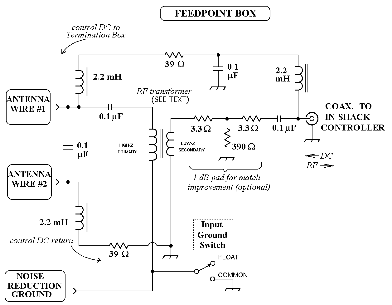 Figure 1 (click here to view) shows the overall set-up if using a twisted-pair Beverage or Ewe antenna. Any two wire conductor (such as lamp cord, speaker wire, TV twinlead, or coaxial) can be used. Twisting the leads is not necessary in this application. Note that three boxes are identified: the (in-shack) Controller, the Feedpoint Box, and the Termination Box. These are all very simple circuit-wise.