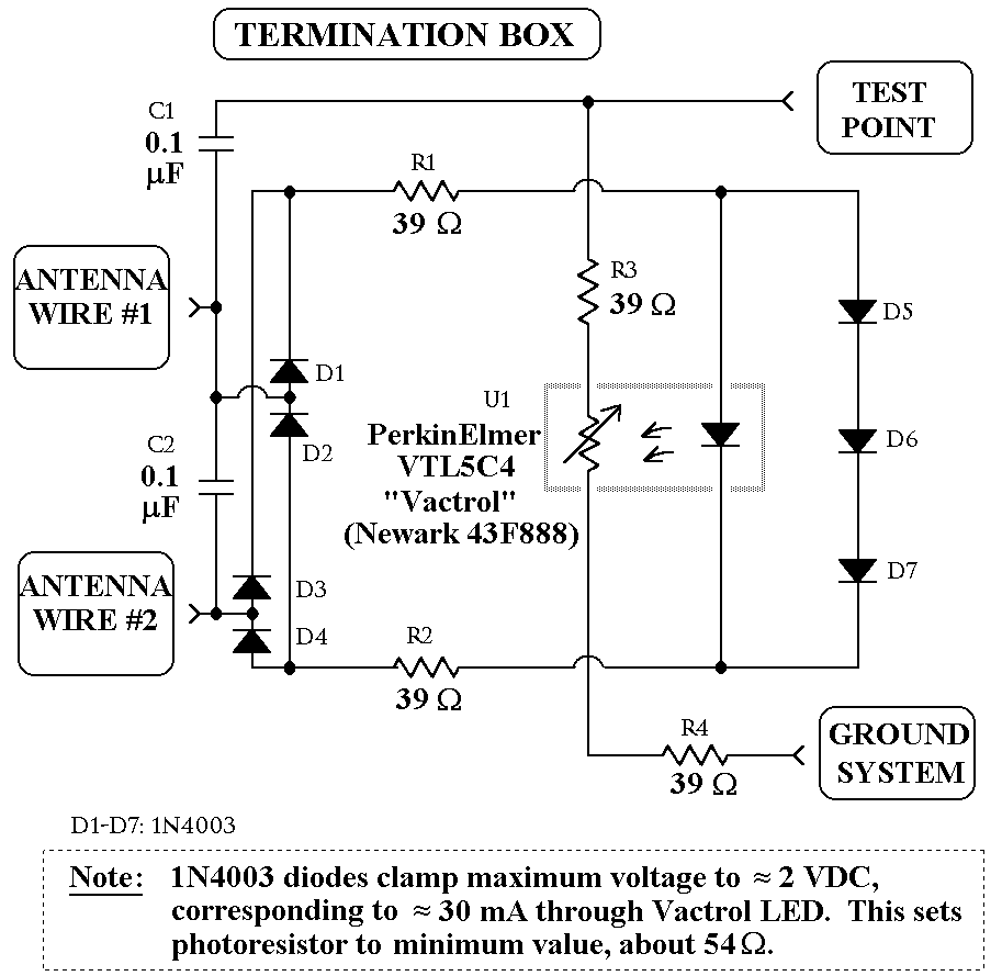 Figure 5 (click here to view) is the Vactrol-based Termination Box. The test point allows output resistance to be measured by means of an ohmmeter clipped from this terminal to the Ground System jack. The Vactrol range is about 54 ohms to greater than 20K ohms. Because two 39 ohm resistors (78 ohms) are used in series with the Vactrol termination (for smoother adjustment in the critical 400 to 1400 ohm range), the measured output resistance will be in the range of 132 ohms to greater than 20K. A "sanity check" of the three boxes can be done on the test bench by the following procedure: Two clip leads would take the place of the twisted-pair antenna going from the Feedpoint Box to the Termination Box. With the Controller potentiometer set for an arm voltage of 0 volts, maximum resistance is noted at the Termination Box. With the Controller potentiometer set for an arm voltage of 9 volts, minimum resistance is noted at the Termination Box. Because of the voltage-dropping resistors in the Feedpoint Box, a maximum voltage of about 5 to 6 VDC should be measured across the two antenna input jacks of the Terminator Box. If the antenna set-up is going to be permanent rather than "DXpedition temporary", some sort of static protection could be added (as Steve Byan did in his design).