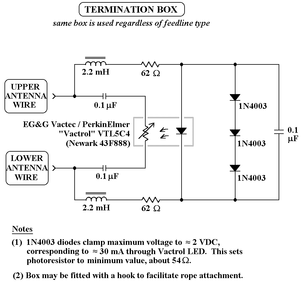 The layouts of the Controller, Feedpoint, and Termination boxes are not critical. Documentation presented herein is limited to electrical schematics. Commonly-available parts are noted by value only. Unusual components are noted with vendor stock numbers. For a list of parts vendors I use often, check vendors.htm .