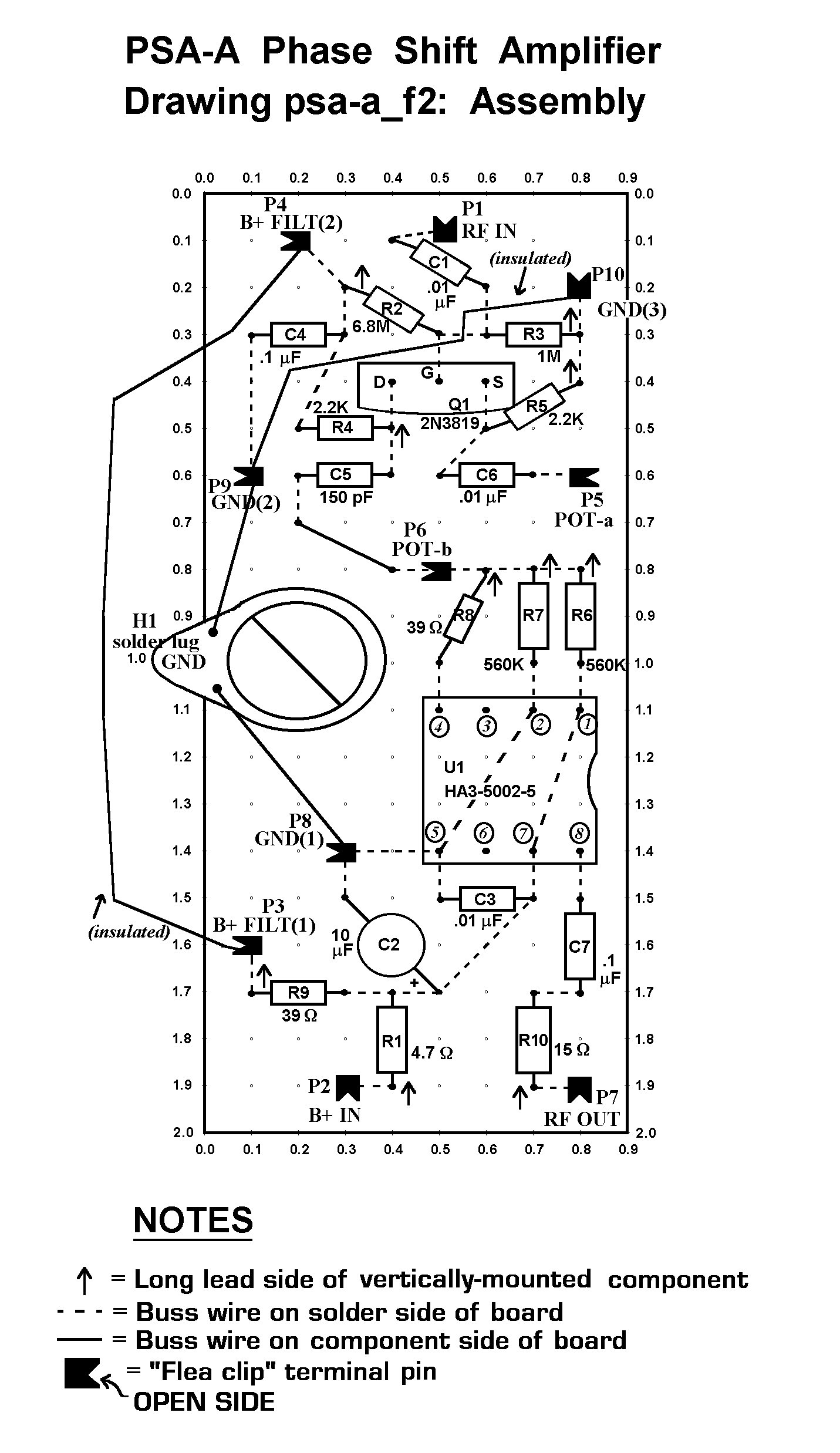 The PSA-A Phase Shift Amplifier provides a high impedance to low impedance buffer amplifier function as well as the ability to yield a variable phase shift when used with an external 100K potentiometer. Typically two antennas would be presented to the input of a phasing unit comprised of two PSA-A's: one amplifier for each antenna input. The outputs of the two amplifiers are then combined to facilitate nulling of interfering signals. A dual potentiometer should be used. It should be configured such that the resistance to one of the amplifiers is at the maximum 100K value when a minimum (zero ohm) resistance is presented to the amplifier on the other antenna line. Each amplifier should provide at least 100 degrees of shift over the 150 kHz to 5 MHz frequency range. A 0 / 180 degree transformer-with-switch arrangement on one of the input lines will give additional flexibility and nulling range. Each input should have a level pot (1K typical) such that "pest" station amplitude may be matched; this is a necessary condition for nulling as well as the phase being adjusted for a +/- 180 degree difference of one PSA-A amplifier output relative to the other. Level pots will also be usable in strong-signal areas to prevent amplifier overloading and resulting distortion products.