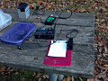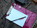I purchased an inexpensive 6-inch by 9-inch, acrylic clipboard at my local office supply store. I used some GOOP adhesive to attach two steel washers to the clipboard, as shown in Figure 1. I made sure that the washers lined up with the magnets on the base of the paddles. Figure 2 shows the paddles attached to the clipboard. Figure 3 shows the clipboard in use during a recent outing. For transport, the little clipboard fits in the small plastic container I use for the HB-1B and accessories.