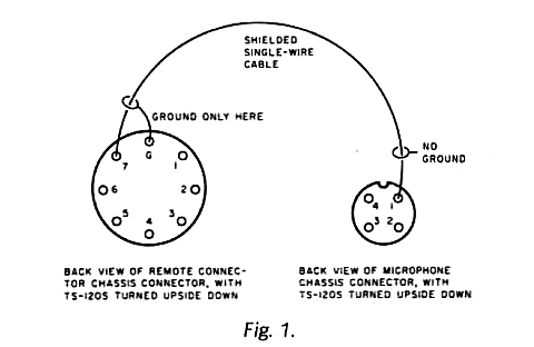 A bit of study of the schematic wiring diagram for the TS-120S reveaed an unused terminal (#7) on the remote connector. More study revealed that audio signal and send-receive functions were available at the remote connector. Ah, now if one had microphone input also available ... Could it be just a matter of piping a wee bit of audio to the mic input jack from that unused (#7) terminal? It looked feasible on paper, but it pays never to leap too precipitately to conclusions. So the next step involved a bit of exploration of the innards.