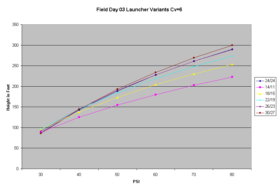 It is interesting to note that the performance doesn't really change all that much for these different sized launchers. Unfortunately this doesn't quite match reality as we've measured it. There are other effects which tend to make the smaller launchers underperform somewhat more than is indicated here. My theory is that the lesser flow fails to open the spring-loaded valves as far, so the effective system Cv drops somewhat for small pressure chamber volumes.