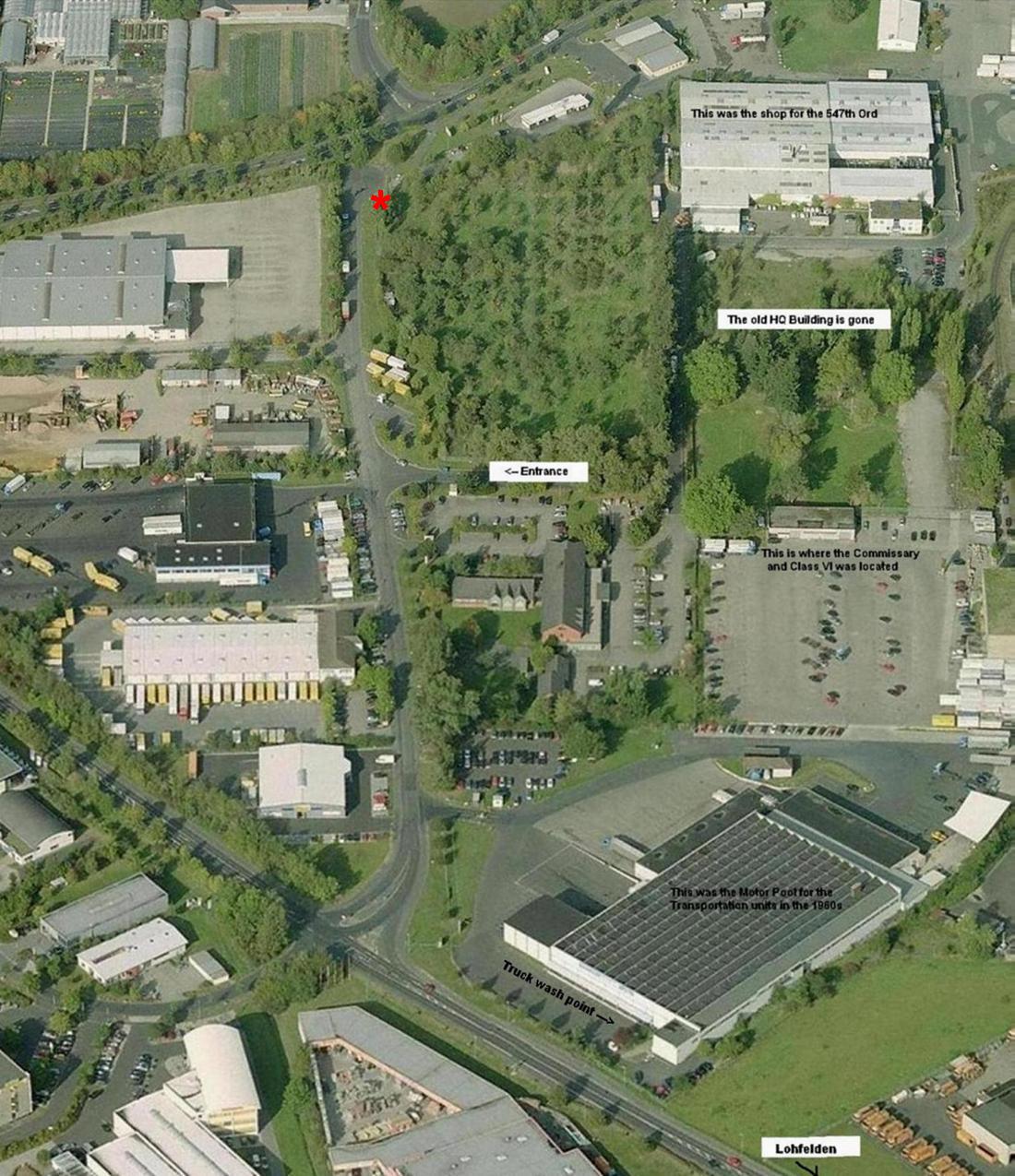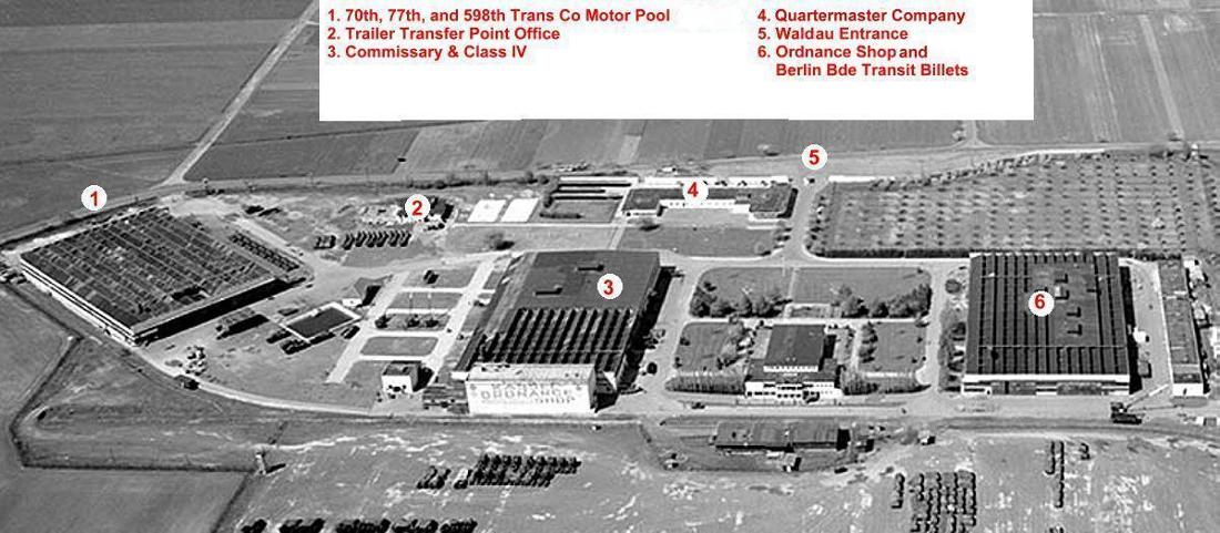 In the years shortly after the War, Waldau was used mainly as a Rebuild Facility, run by the 7843rd Ord Company, and German Civilians doing much of the repairs. The large building to the left (1) was used to park there lowboy trailers and trucks, the building shown as the Commissary (3) was a motor pool repair building, and the large building to the right (6) was the Rebuild Shop. The small building in the center was the 7843rd Barracks, Mess Hall, Day Room, etc. The 7843rd Orderly Room was in building (4), while number (2) was the telephone switchboard building. There was a unexploded bomb in #2, that went through the roof and floor, that was barricaded off, and left in place.