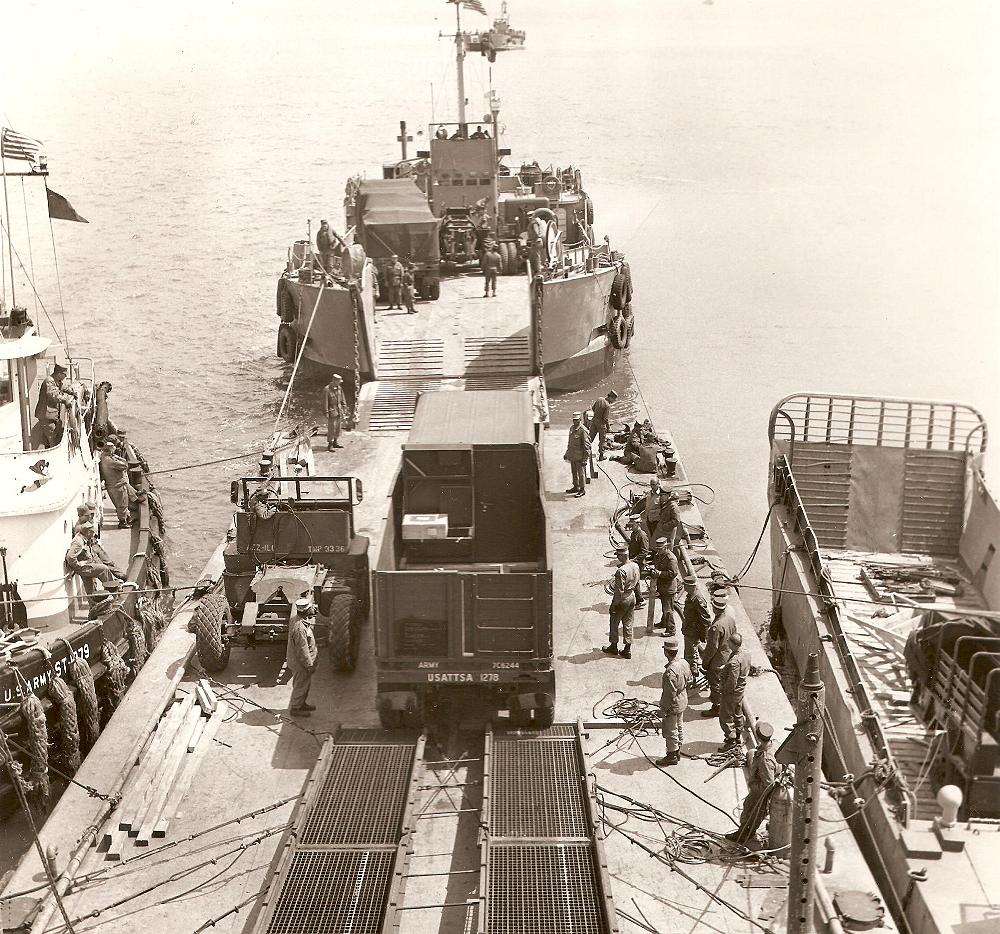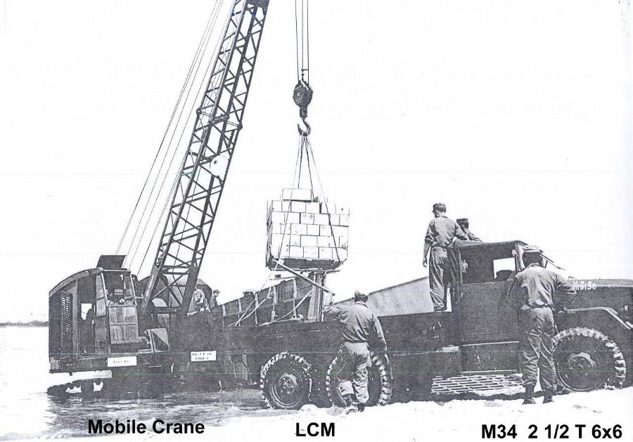 LCM's freshly loaded from anchored ship, are now off loaded to trucks.