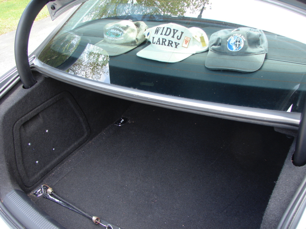 The car battery is in the trunk, under the spare tire. The power cables can be see to the left.