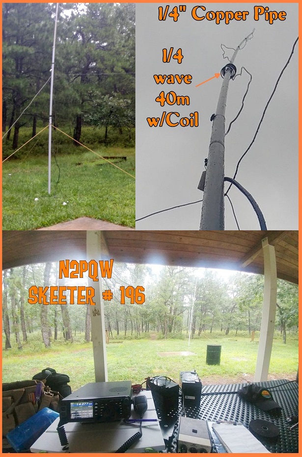 to pretty icky, so only 2 of us braved the elements. N2JJF operated CW using the club's callsign, N2MO, while I used my own, in voice mode. I used my trusty YAESU FT-991A and a pair of 28aH AGM batteries for power. Antenna was a home-brew 1/4-wave vertical for 40m, constructed of 1/4" copper water tubing. A loading coil is about 5ft from the base to keep it short and manageable. The whole affair was vinyl-taped to a fiberglass mast, and guyed for support. A few elevated radials were stretched out to complete the system. My contact rate was not spectacular, but I'm not an old hand at QRP operating, so perhaps as well as can be expected. Regardless of the results, it was certainly fun to get to the park for an afternoon, and continue to hone my skills as an Amateur operator. Attached, please find some photos of the arrangements, along with my Log and Scoring sheet. Thanks for continuing to promote this event! Maybe next year Amazon will ship us the good WX on time. Cheers, David Drapkin / N2PQW 2020 Skeeter #196 |