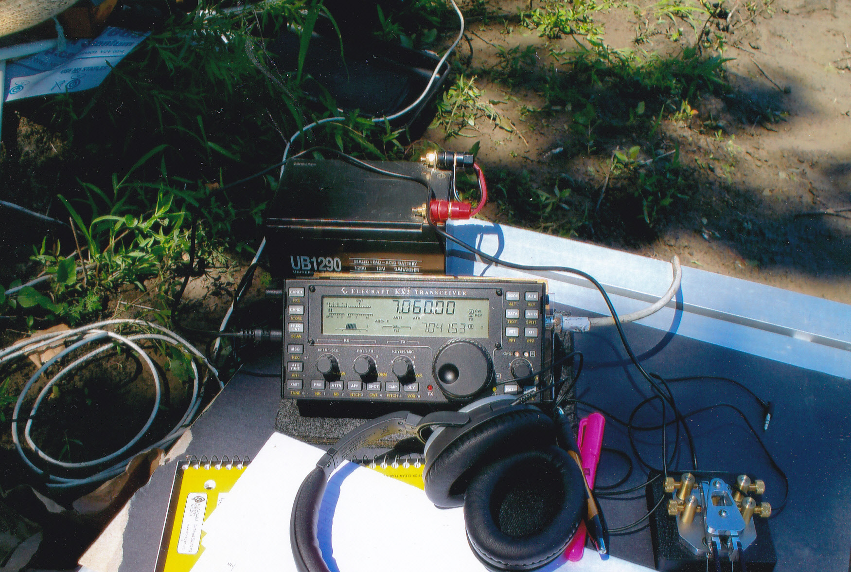 from the field. The XYL and I were out in VE6 land terrorizing / traumatizing kids and grandkids for 2 weeks so not a lot of time to operate. But a lot of fun. Thanks. Here is a photo of my complete KX1station including antenna (9m of wire and two 5 m counterpoises) and power ready for action. |