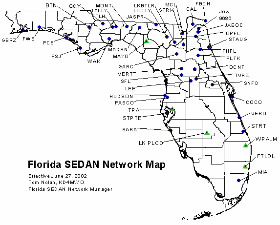 The primary goal of the SEDAN is to provide both emergency and keyboard to keyboard interactive communications. The SEDAN supports the 145.770 MHZ frequency as an emergency frequency. The SEDAN nodes operate on the (X-IJ+) packet mode. The SEDAN also supports a 6 meter 51.120 MHZ 9600 baud backbone.