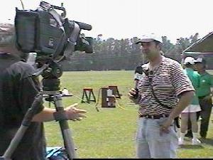 Cameraman from WNCT-TV, Channel 9 in Greenville, interviews Pat, KD4NNA, about the Field Day activities and Amateur Radio participation by BARC during the Hurricane Floyd Floods in 1999.