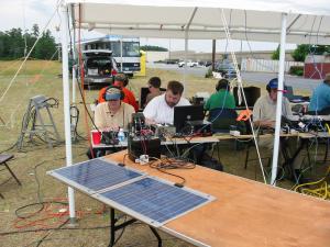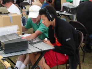 | Dave, KV4CN, assisting a Boy Scout visitor, Chris, get some contest points. | Peter, KG4WEZ, trying to pick up a satellite contact while LaSalle Boston looks on. | |||||||||||||||||||||||||||||||||||||||||||||||||||||||