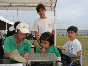 | Dave, KV4CN, assists as Boy Scout David Landry, 13, makes several contacts while his brothers Will, 9, and Andrew, 5, look on. They are the grandsons of W4YDY | Cub Scout Will Landry takes a turn at the mike and also made several contacts. | |||||||||||||||||||||||||||||||||||||||||||||||||||||||