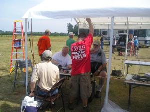 BARC Field Day Co-chairman Richard, KE4SNE, wiring the panel and Co-chairman John, KE4TZN, driving ground rods for tower. Tod, KG4CCX, is brave holding the ground rod! |