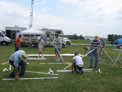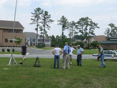 a group gets ready to take down John's, K4KBB, portable tower that held