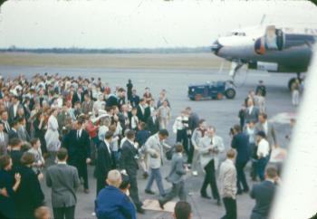 12 - Team descending the stairs. Bill did come back close enough to reconnect the mike cable. I don't think the players feet touched the ground until some time later when they got of the plane. |