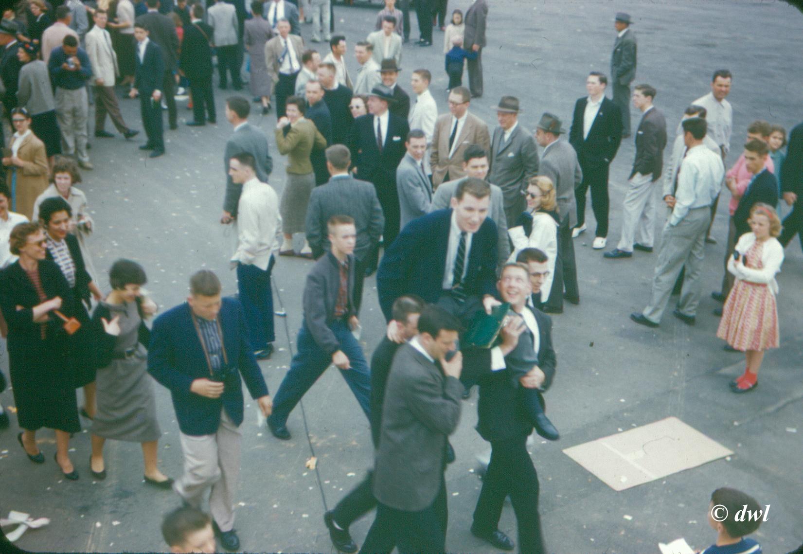 2 - More of the crowd at the gate and on top of building. You can see that the boarding gates were not very big and out in the open. |
