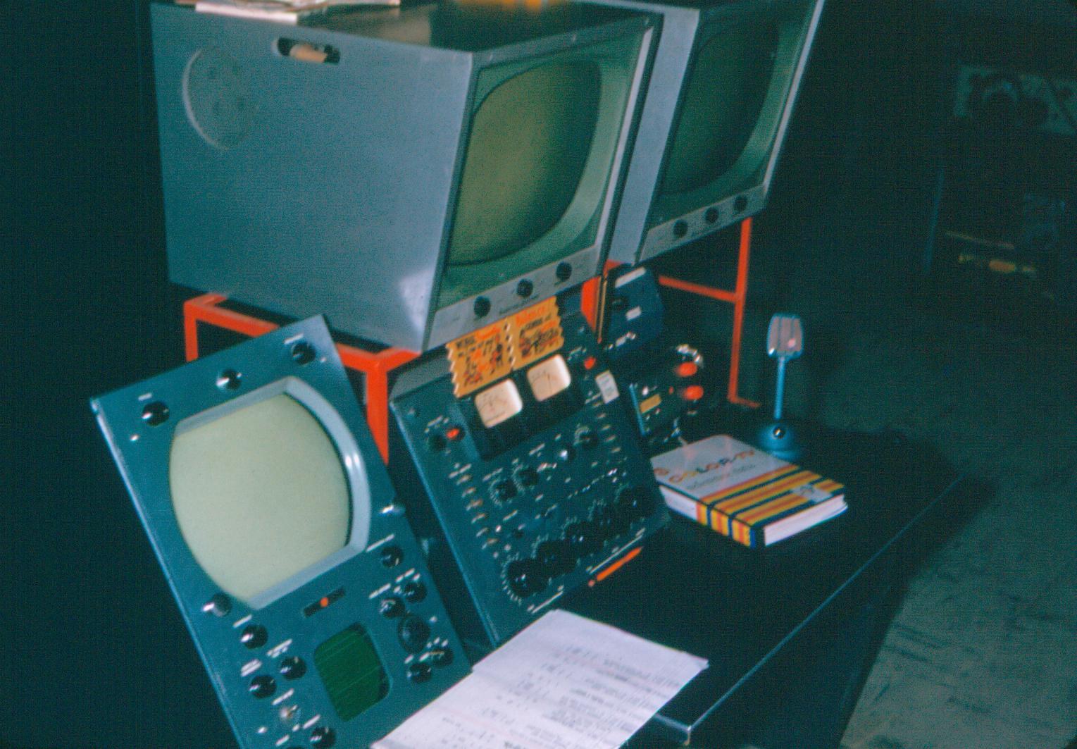 Control console where video was switched between studio in Chocowinity and NBC. Microphone was for 26 Mc (MHz) 2-way communications between transmitter and studio facilities. White paper on table was the program log that was followed by engineer so he would know when station breaks came. No color monitor. |