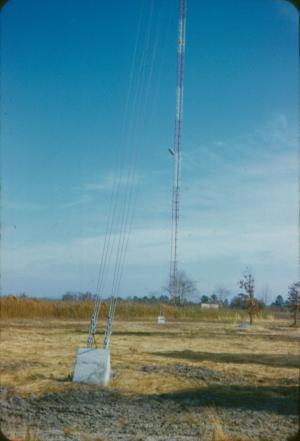| Tower view from front of building. Lower reflector for NBC and upper reflector was for studio feed. | View of tower, building and the two anchor points Southwest of the tower. |