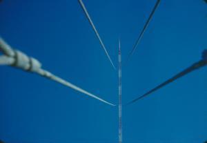 | Back of transmitter building. Microwave dish to studio on left, NBC feed from telco on right. Worker doing finishing touches on tower. | View of tower from outside anchor point. Double guys were used at each point on tower. |
