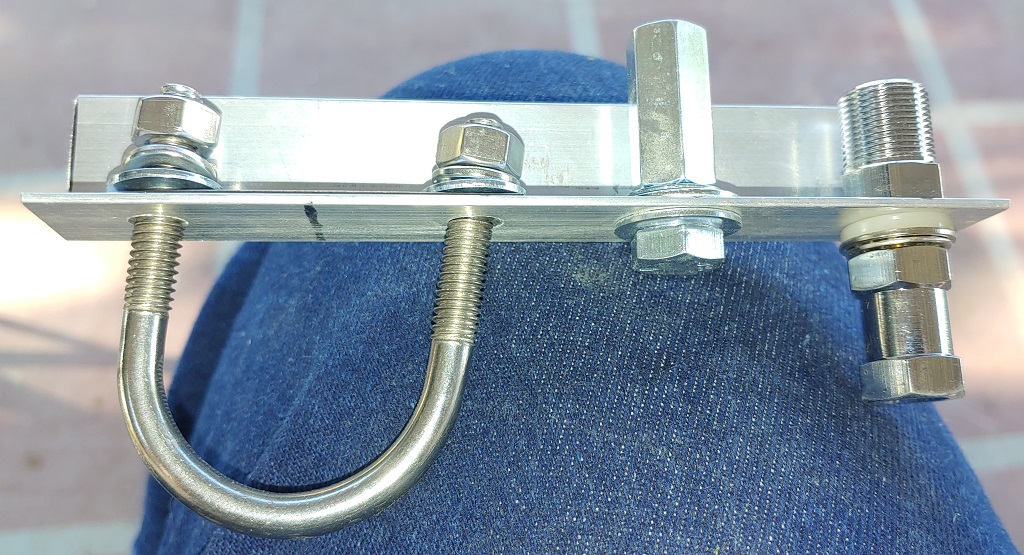 I put the coax adapter at the outside, but it would probably work just as well if the other hamstick was on the outside. I prefer to use flat washers to spread the load a bit better on the aluminum, and lock washers to hold things together without a lot of torque. The steel bar that comes with the U-bolt keeps the angle stock from bending if you do torque it onto the mast, but it really doesn't take much torque to hold.