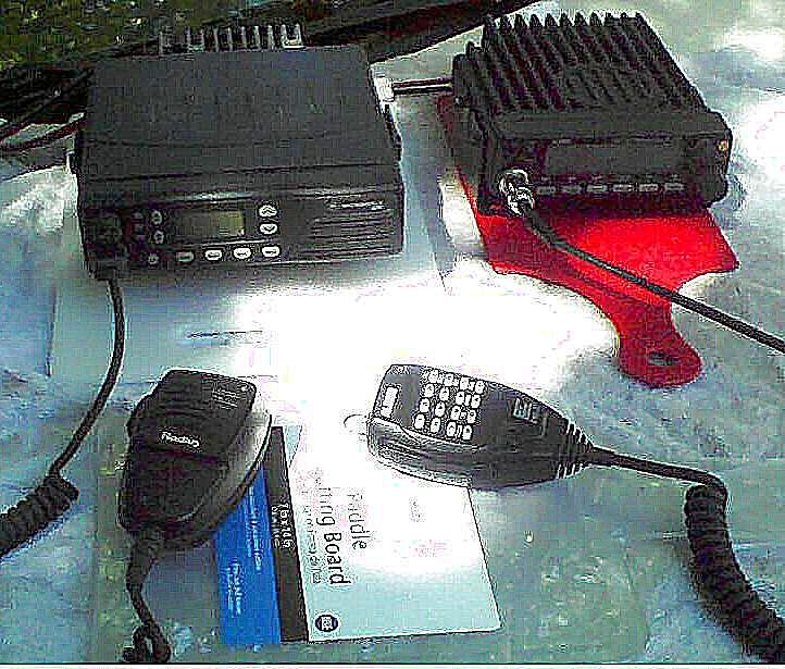 Left- Motorola GTX 900 MHz on small Walmart cutting board. Right - Alinco 220 MHz on Betty Crocker paddle cutting board. Front - Walmart paddle cutting board wrapped.