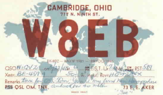 Thanks to W1TE, I was able to obtain a qsl card with the call sign of W8EB dated May 22, 1948. Joe Aker of Ohio was assigned the callsign of W8EB from 1947 through 1978 when he became a silent key (SK).