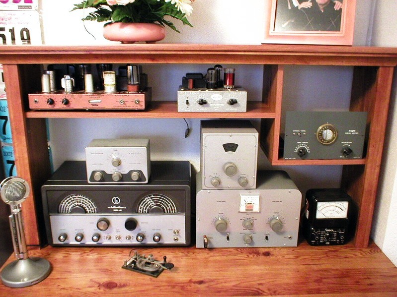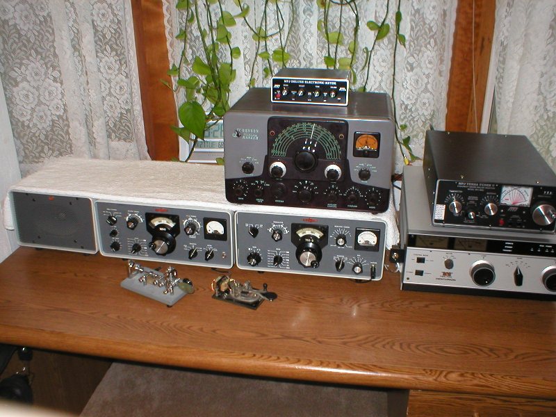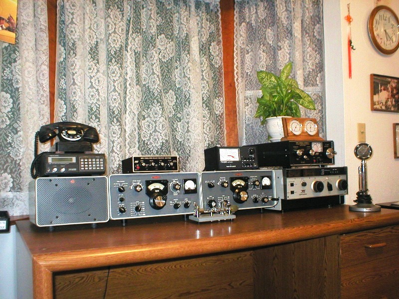 THE ANTIQUE STATION. TOP LEFT TO RIGHT. EICO 730 MODULATOR, AMECO AC-1 TRANSMITTER AND OCEAN HOPPER RECEIVER. BOTTOM LEFT TO RIGHT. HALLICRAFTERS S-85 RECEIVER WITH HEATHKIT Q MULTIPLIER, HEATHKIT AT-1 TRANSMITTER WITH VF-1 VFO AND SIMPSON 270 VOM. I USED THE AT-1 AND S-85 IN MY NOVICE DAYS IN 1954.