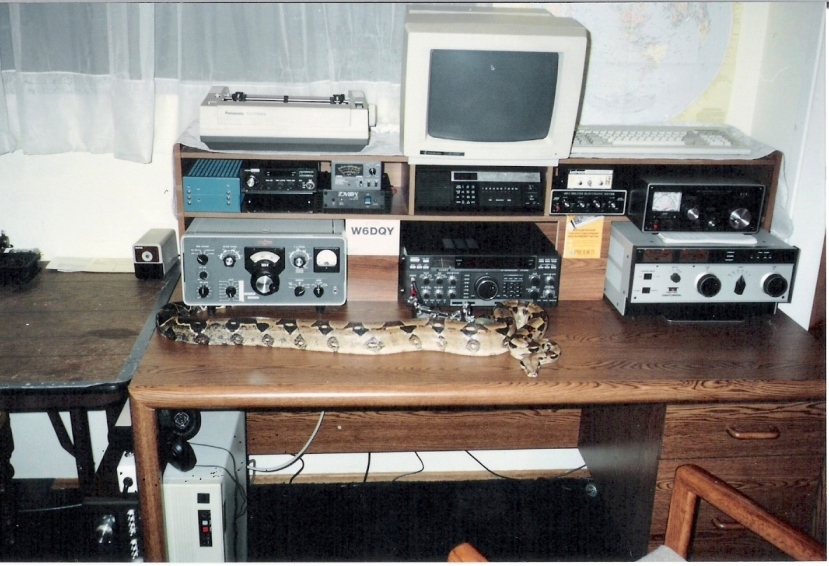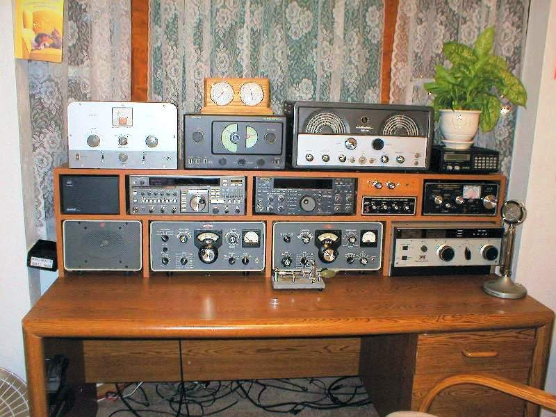 LEFT TO RIGHT: TOP: AT-1, S-38, S-85 AND RADIO SHACK SCANNER. MIDDLE: 12 V POWER SUPPLY, FT-736, TS-870S, KEYER AND MFJ TUNER. BOTTOM: SPEAKER, 32S-3, 75S-3 AND TEN-TEC AMP.
