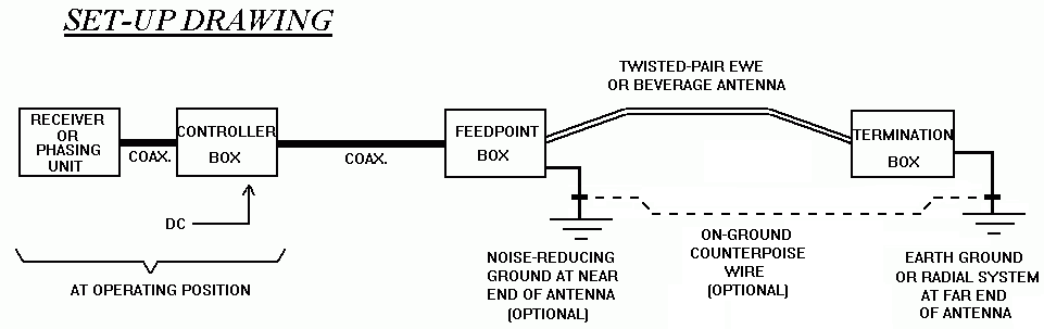 Figure 1 (click here to view) shows the overall set-up if using a twisted-pair Beverage or Ewe antenna. Any two wire conductor (such as lamp cord, speaker wire, TV twinlead, or coaxial) can be used. Twisting the leads is not necessary in this application. Note that three boxes are identified: the (in-shack) Controller, the Feedpoint Box, and the Termination Box. These are all very simple circuit-wise.