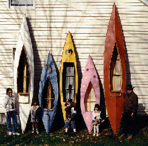 Here is Bernice and I with the Grand Kids A large part of the Ham Radio hobby for me was building. It is also a large part of my Kayaking Hobby. I enjoy designing and building kayaks, particularly when it is for the grand kids. The grandchildren, Kalyn, Scott, and Heather each received a boat for their fifth birthday. It's amazing, but they paddle quite well in a short while. | |