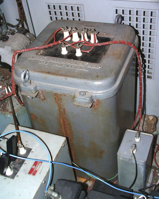 | This inside view show the four 833 tubes. Above is the cooling fan which blows out the top of the cabinet. In the upper right, is the final tank coil which is motor controlled for frequency tuning from the front panel. The two 845 modulator drivers are visible at the lower left corner of the picture. The large Variac below the 833 shelf provides adjustment for the filament voltage. | This page wouldn't be complete without a picture of the iron. The XT-1-A modulation transformer is about 2' high by 1' plus square. |