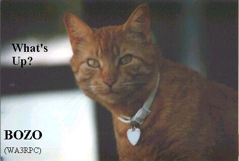 Bozo was born in a little town in New York, near a small city called Port Jervis. No, there is not water there, it is not a Port, but that's a long story. He was the only child of a Mother cat called PATCHES. She was named Patches, because she was wild, had no home and looked like she was all patched up.(a little bit like your Ham Shack). She was the color of a quilt that was made of odds and ends. Her son Bozo turned out to be an orange tiger cat. OH ! and he is what is called an "Up Tail" Cat. Some pussy cats are "up tailed" but most cats are "down tailed". It has been said that he likes the Stars, and therefore keeps his tail pointed up. Of course the tail being up, also acts as a vertical antenna and that helps with the DX. Quite a cat!
