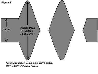 If the transmitter modulation is increased until the peak RF voltage is 2.5 times the original carrier RF voltage, the peak RF current occurs at the same instant, and it is also 2.5 times as great as the original carrier RF current The result is a PEP of 2.5 * 2.5 = 6.25 times the un-modulated carrier power (see Figure 2).