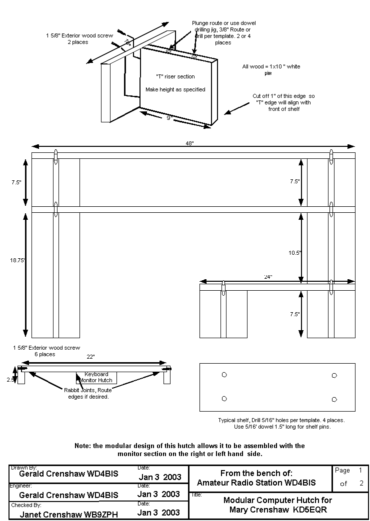My Daughter KD5EQR asked me while home on Christmas break to make her a hutch for her desk at Texas Tech. The hutch outlined here is the result of that request. Easy to assemble and transport and made out of 1x10 pine.
