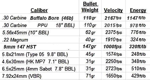 The M1 Carbine, when used in a pistol configuration, has better overall ballistics than an AR Pistol in 5.56. The 5.56 is a little faster, but just slightly out of a short barrel, and the little 22 cal bullet has low energy with out high velocity of a rifle barrel. An AK47 Pistol beats them both from a short pistol length barrel, but the down side of the AK pistols are they are very bulky and heavy compared to my little Advisor Pistol. These top 2 Carbine rounds are from longer barrels that would be about 200 fps lower from a pistol length barrel, and the engery drops only slightly, with the heavier bullet from the Carbine.