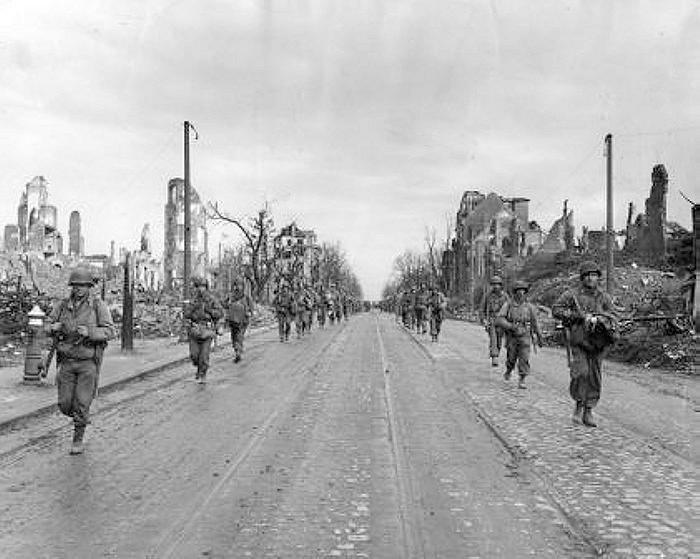 The Infantry assaulted the city from the south and west. Bitter resistance was met at the outskirts of the city, from dug-in infantry supported by high velocity direct-fire weapons and heavy tanks. The tanks which were used in the defence of Kassel, were the first that the 702nd Tank Batallion had met in any number since leaving the area of Losheim a few weeks earlier. The unit involved was the Panzer N.C.O. School, Eisenach, and originally had thirty-two tanks, divided into four companies of eight tanks each. Companies 1, 2, and 3 had Mk. IV tanks while 4 was equipped with Mk. V's. At first Tigers were reported in the vicinity, but they were found to be dead tanks having been destroyed by their own crews.