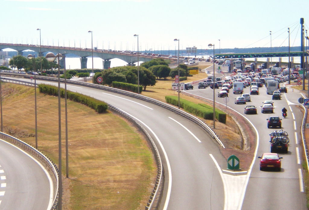 The bridge now going to Ile de Re. This was built in 1988. The bridge has 2 regular lanes, and also 2 bicycle only lanes. The bridge is 2.9 KM long. A Ferry Boat can still be taken to the island also.