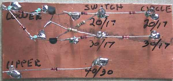 The yellow arrows point to the connections that are used at the band switches. The yellow boxes enclose the labeling and the holes that are used to solder the connections. The switches will already be installed by the time you install these wires. If the wires from the circles directly to these switches were installed during "Mounting/Testing Board 1" instructions, take them off as they will prevent the automatic switching from working. Back to Automatic Switching with the Board 1 Switches |