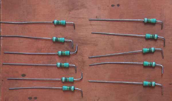 The PCB ground plane above is about 2" by 4" and the resistors are approximately 10 megohm. The 11 resistors are used for standoffs in building the circuit. The circuit can be built on a smaller piece of PCB, but I used a large piece to help clarify the building process. Bend one lead as shown and cut. The bend in the lead gives a much better solder joint than just sticking one end into a pool of solder. |